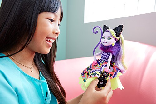 Shut the storybooks you thought you knew because at Ever After High, you can Choose Your Own Ever After! For these teenage sons and daughters of the most famous fairytales ever, every day can turn into an epic day. In the epic Netflix Original Series, “Way Too Wonderland,” Raven Queen, daughter of the Evil Queen, tries to magically reverse her mother’s curse on Wonderland and accidentally transports herself and her friends to Wonderland High. As Kitty Cheshire, Madeline Hatter, Apple White and Lizzie Hearts fall down the rabbit hole, their outfits transform into spellbinding dresses with wonderlandful charm. Kitty Cheshire doll, daughter of the Cheshire Cat from Alice’s Adventures in Wonderland, is the cat’s meow with her cat’s tail and wearing a dress with bold neon, beautiful pastels and a playing card-inspired print on the asymmetrical layered skirt. A colorful yellow hairstreak and oversized black headband with exaggerated cat’s ears are “just right” for Wonderland. Hexquisite detail, spelltacular shoes, a fableous faux fur collar and cuffs and a timely black pocket watch (that opens!) complete her charming look. Use the doll stand to capture the posable doll in a magical moment. Also comes with a doll hairbrush and bookmark with hexclusive content. Collect all of the Ever After High characters for Wonderland-iful fun (each sold separately)! Includes Kitty Cheshire doll wearing fashion and accessories, pocket watch, doll stand, doll hairbrush and bookmark. Doll cannot stand alone. Colors and decorations may vary.